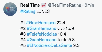 Gran Hermano trepó rápidamente a los 20 puntos y casi nunca bajó de esa cifra impactante para las audiencias que se miden hoy. Al contrario, fue subiendo y subiendo hasta tocar picos de 25 como los que obtuvo la noche de la expulsión de Juliana y los reingresos de Daniela, Agustín y La Tora.
