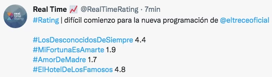El Hotel de los famosos picó de movida en 4 puntos, pasó a 5 y en sus momentos de mayor audiencia tocó los 7 y rozó los 8 puntos. Del otro lado, Gran Hermano se mantenía en 22, 23 o 24. Una cosa de locos. Los 5 programas más vistos del día fueron de Telefé. Gran Hermano lideró con 22,4 de promedio final. Segundo se ubicó "Gran Hermano el vivo" con 15,4. El podio lo completó Telefe Noticias con 10,4. Gran hermano tarde (9,8) y El noticiero de la gente (9,3) le terminaron de dar forma a ese quinteto líder. ¿Cuánto promedió el Hotel de los famosos? 4,8. En el primer round hubo golpe de nocaut. Veremos si el Hotel se recupera, o le cuentan hasta 10.