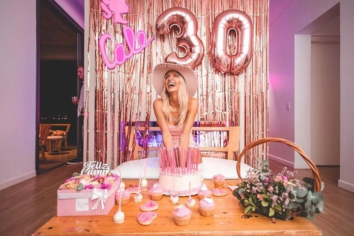 Globos metalizados rosa que formaban el número 30, una torta con tres decenas de velitas rosa en forma de corazón y guirnaldas a tono hacían juego con el look de la homenajeada: vestido corto rosa pastel con tajo y flecos en un costado y espalda descubierta, uñas pintadas del mismo color, sobrero de cowboy rosa con flecos y stras y botas texanas blancas.