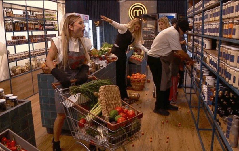 La dinámica empezó después del minidesafío que definió las duplas. Desde la cocina, los participantes escucharon incrédulos cuando Germán Martitegui anunció: “Uno tomará los ingredientes con los ojos vendados, mientras el otro lo guiará con las manos atadas al carrito”. A eso se sumó el aporte de Donato de Santis, quien aclaró con solemnidad: “No olviden tomar doble cantidad, porque luego cocinarán de forma individual”. Con ese combo de presión y maldiciones entre dientes, el desastre estaba servido.