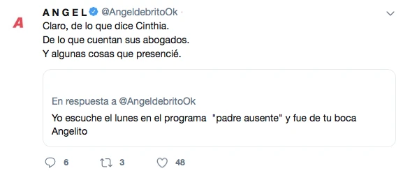 Y ante el comentario de otra usuaria de Twitter que lo acusó a Ángel de haber dicho en su ciclo del Trece que Matías Defederico era un “padre ausente”, el jurado del Bailando retrucó: “Claro, de lo que dice Cinthia. De lo que cuentan sus abogados. Y algunas cosas que presencié”.