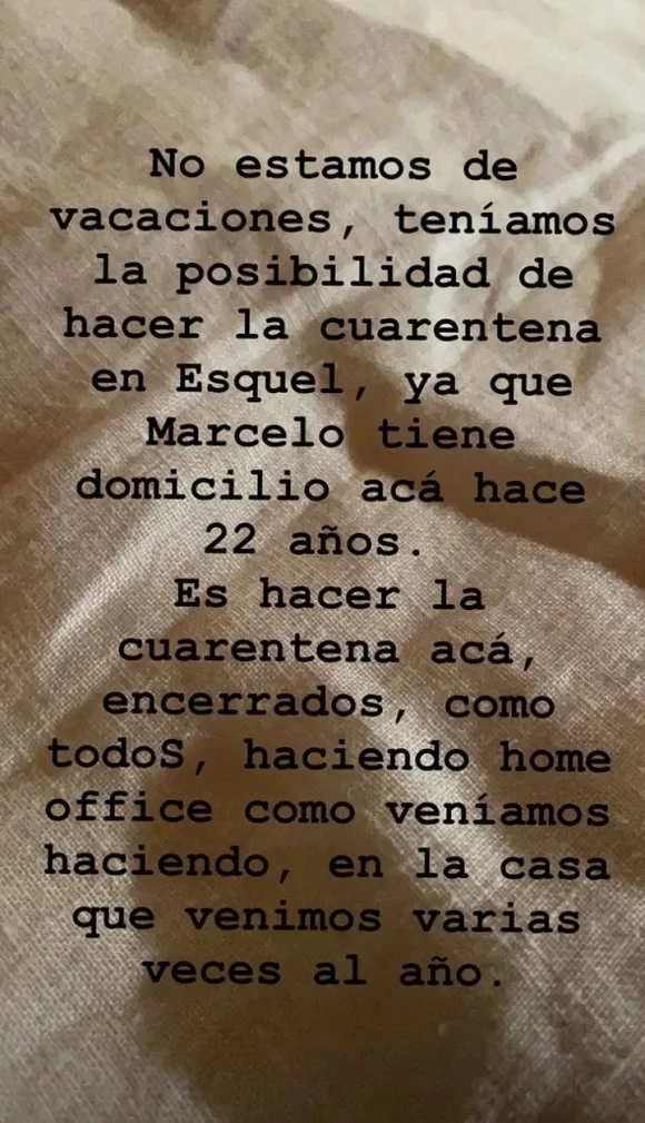 A través de varias stories, la bella rubia contó: “No estamos de vacaciones, teníamos la posibilidad de hacer la cuarentena en Esquel ya que Marcelo tiene domicilio acá hace 22 años”.