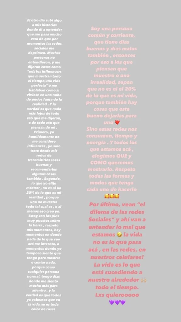 "Muchas personas entendieron cuando dije que las redes me deprimen... muchas personas no y me dijeron cosas como "ustedes, los influencers, muestran todo el tiempo una vida perfecta" O me hablan como si viviese en una nube de pedos fuera de la realidad. La verdad, nada más lejos de todo eso que dijeron, tengo los pies muy bien puestos sobre la tierra", escribió la hija de Marcelo en una historia de Instagram.