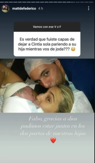 Fue cuando un seguidor le preguntó: “Es verdad que fuiste capaz de dejar a Cinthia sola pariendo a su hija mientras vos estabas de joda”. Fue ahí cuando Matías respondió de forma tajante: “Falso, gracias a Dios pudimos estar juntos en los dos partos de nuestras hijas”.