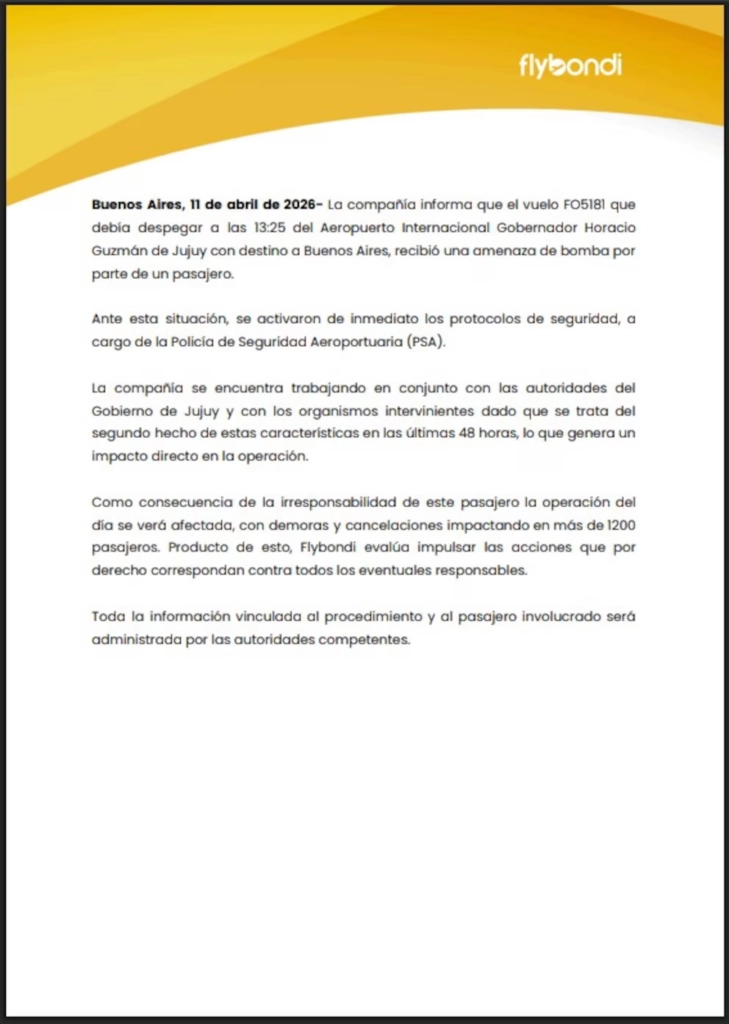 La compañía aérea involucrada también emitió un comunicado en el que detalló que se trató de una amenaza realizada por un pasajero y que, como consecuencia, se activaron todos los protocolos correspondientes. Además, advirtieron que el episodio generó demoras y complicaciones para cientos de viajeros.