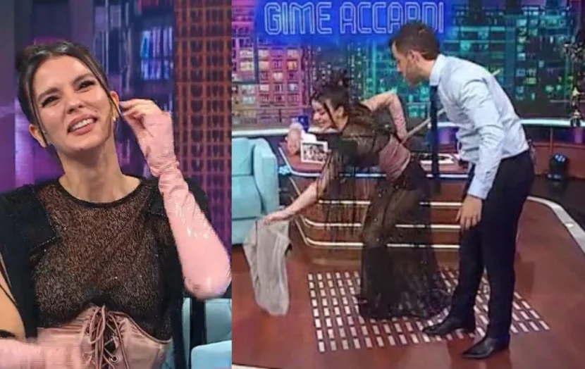 Gimena Accardi visitó el programa de Fer Dente Noche Al Dente (América) y en medio de una entrevista muy compinche y reveladora, vivió un inesperado accidente y terminó limpiando el piso del estudio en un suceso que fue algo confuso.