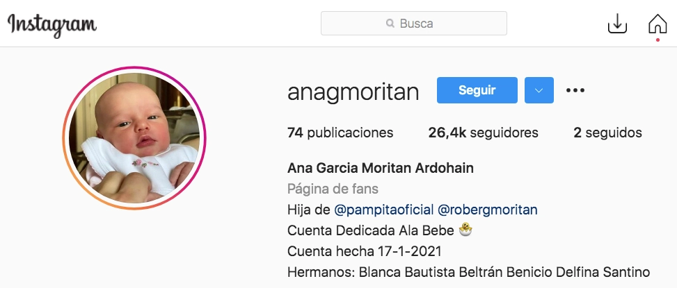 Los tiempos cambiaron. Las personas también. Y las costumbres, ni hablar. Si antes los bebés "venían con un pan bajo el brazo", ahora llegan al mundo "con una red social en las manos". A un día de cumplir su primera semana de vida, Ana García Moritán Ardohaín ya tiene cuenta de Instagram. Sí, y suma más seguidores de los que muchos juntarán en toda su vida.