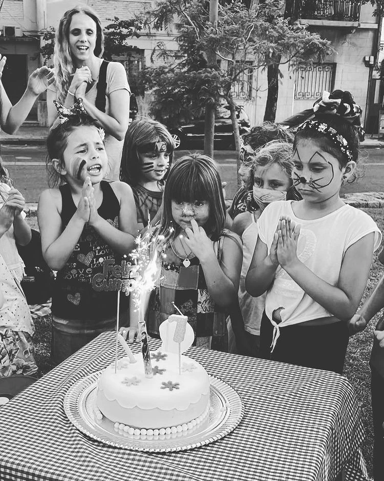En las dulces postales se la puede ver súper sonriente por el festejo de su cumpleaños y muy feliz jugando en la plaza con sus amigos. En una de las imágenes, Asia está posando cerca de su deliciosa en tonos blanco y rosa, con un enorme globo con el número siete, y muy bien acompañada de su padre y sus amistades.