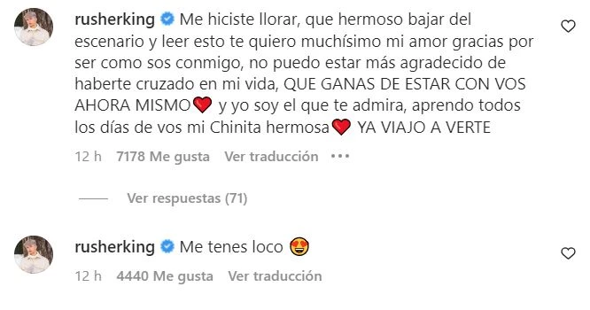 “No puedo estar más agradecido de haberte cruzado en mi vida. Qué ganas de estar con vos ahora mismo. Y yo soy el que te admira, aprendo todos los días de vos, mi Chinita hermosa. Ya viajo a verte”, terminó, con muchos corazones rojos. Y abajo agregó: "Me tenés loco". ¡Son puro amor!