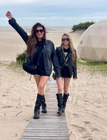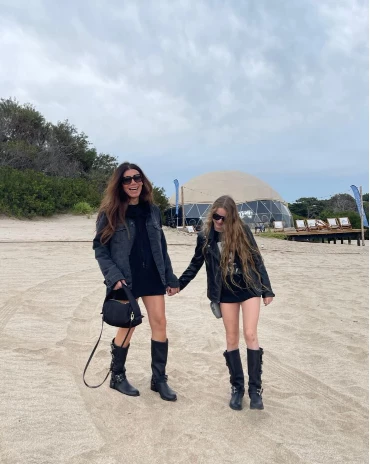 A ambas se las puede ver con looks iguales para las fotos. Madre e hija se vistieron con las mismas botas negras, con hebillas al costado, minis negros, remeras al tono y camperas motoqueras de cuero.