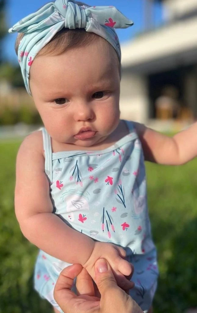 “Llegó el verano y Ana ya está preparada para la pile y el mar”, escribió Carolina debajo de una tierna postal donde está levantando a la beba en brazos mientras luce un outfit florido que incluye traje de baño y vincha en composé. Obviamente, más allá de la hermosa sesión se trataba de un chivo para una marca de prendas para niños y sustentable.