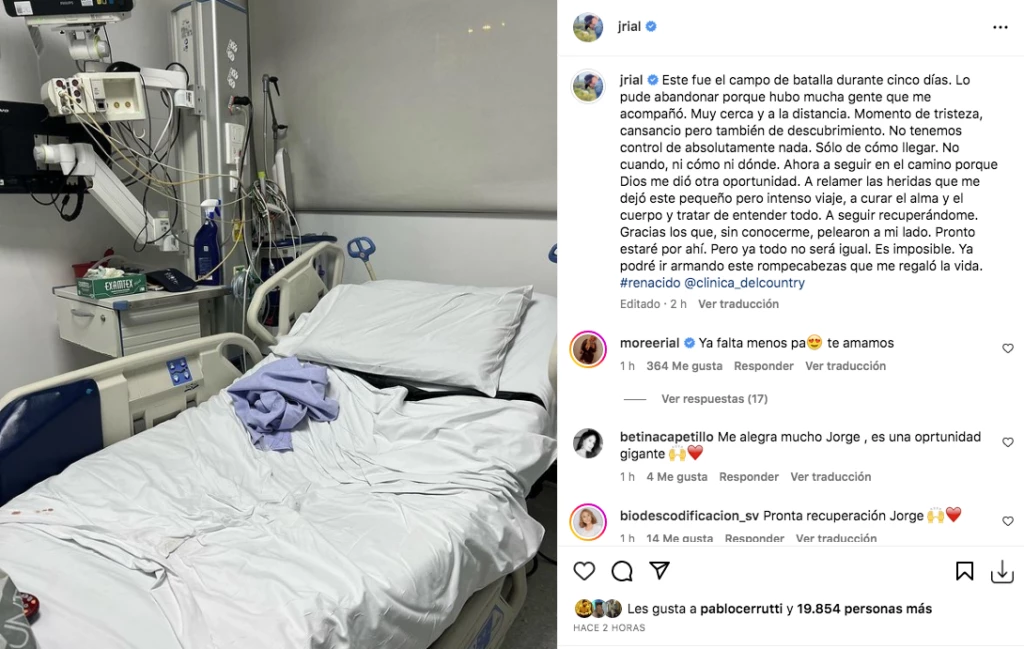 Jorge Rial hizo un fuerte posteo al abandonar la clínica en Bogotá, la capital de Colombia, tras conseguir el alta médica para ser trasladado a Argentina y continuar con los cuidados médicos acá. El conductor publicó la imagen de la cama donde estuvo internado desde el fin de semana pasado hasta ahora junto a un profundo mensaje que decidió compartir en su cuenta de Instagram.