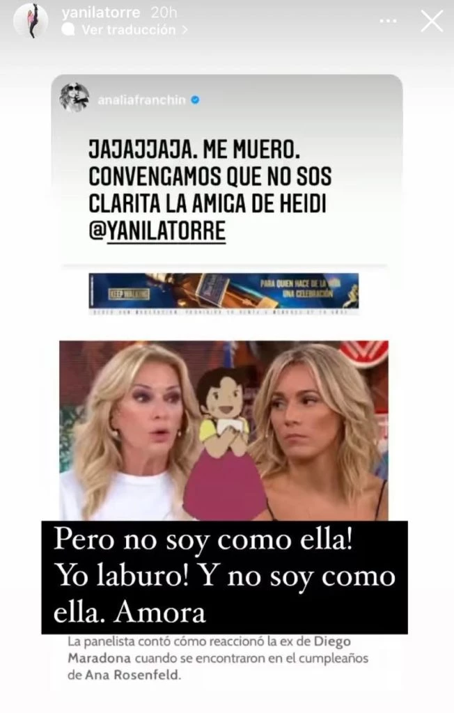 Posteo que la propia Yanina replicó en sus historias de instagram recogiendo el guante y redoblando el ataque contra Oliva. “Pero no soy como ella. ¡Yo laburo! Y no soy como ella, Amora…”, escribió la angelita, fiel a su estilo polémico.