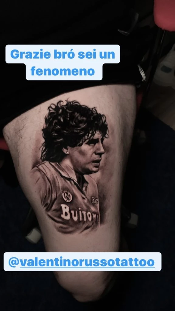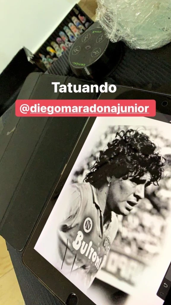 Sin embargo, ya recuperado y óptimo de salud, Diego Jr. decidió asistir al estudio de su amigo tatuador, y poner en su piel el recuerdo del rostro de su padre, mientras aún era jugador del Napoli.