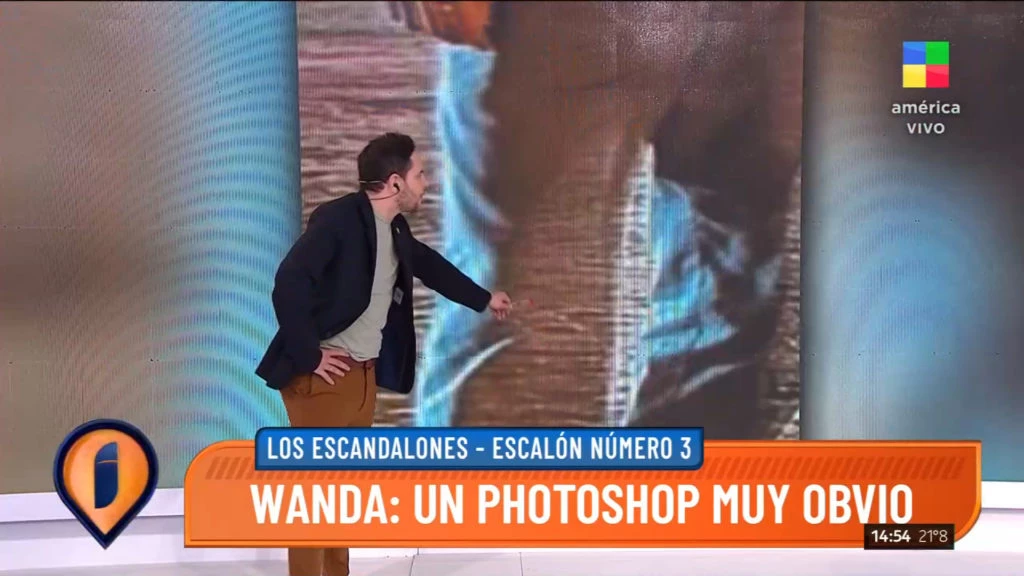 Asimismo, agrandó la imagen en la pantalla gigante y detalló: "Ella insertó al marido en la foto, en un hecho photoshopero récord de la historia. Aquí puede verse directamente como el adoquín del piso se trasluce sobre el pantalón de Icardi”.