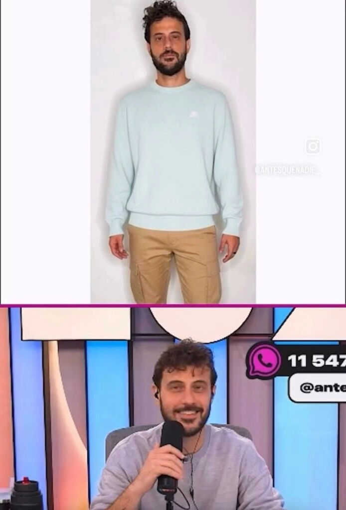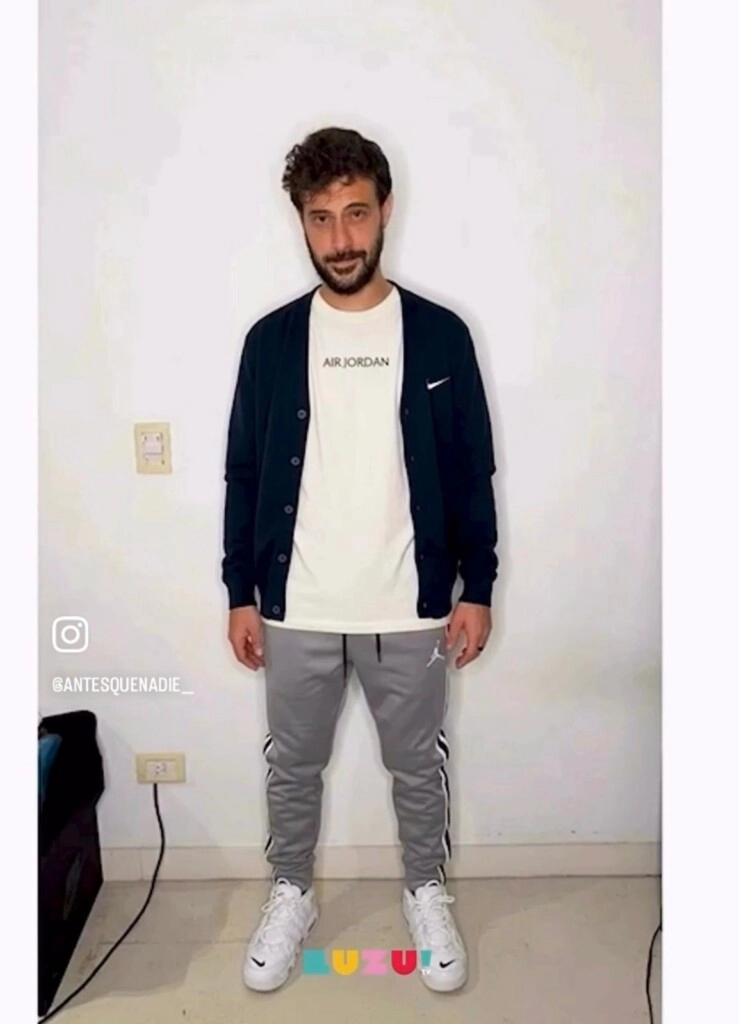“Ahí está mi conjunto de ayer. La foto original es esa pero en calzones. Hasta 100 prendas es gratis. La probadita virtual te sale, te cobran. Uno es gracioso porque me hizo hasta con la mochila puesta. Mucho realismo. La app no es de Argentina”, remató Leuco.