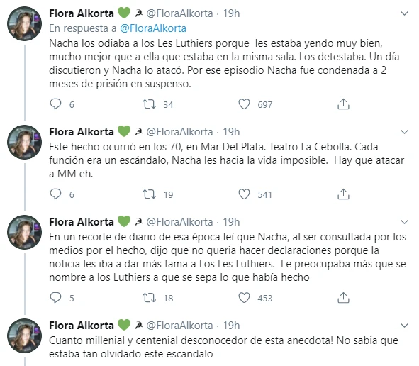 Al finalizar, Flor contó que Nacha no había querido dar declaraciones de los hechos: “En un recorte de diario de esa época leí que Nacha, al ser consultada por los medios por el hecho, dijo que no quería hacer declaraciones porque la noticia les iba a dar más fama a Los Les Luthiers. Le preocupaba más que se nombre a los Luthiers a que se sepa lo que había hecho”.