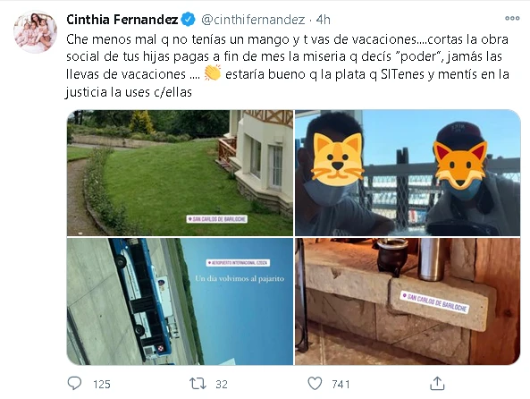 “Che menos mal q no tenías un mango y te vas de vacaciones....cortas la obra social de tus hijas pagas a fin de mes la miseria q decís “poder”, jamás las llevas de vacaciones .... estaría bueno q la plata q SI Tenes y mentís en la justicia la uses c/ellas”, escribió indignada en su cuenta de Twitter junto a las fotos que el jugador publicó de su descanso.