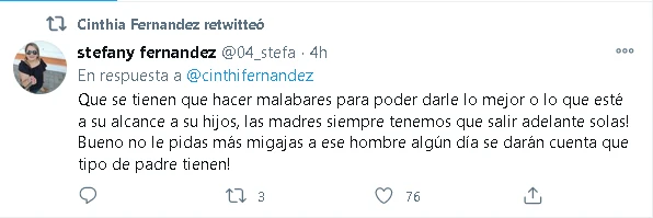 No contenta con eso, la panelista le dio RT al comentario de una seguidora que acompañó el reclamo de Cinthia. “Que se tienen que hacer malabares para poder darle lo mejor o lo que esté a su alcance a su hijos, las madres siempre tenemos que salir adelante solas! Bueno no le pidas más migajas a ese hombre algún día se darán cuenta que tipo de padre tienen!”.