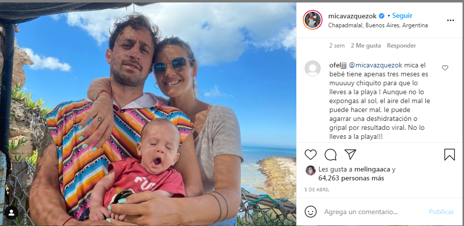Pero sus seguidores no reaccionaron como esperaba. Es que apenas publicó las fotos cuestionaron el hecho de que llevaran a un bebé tan pequeño a la playa en donde la exposición al sol es bastante alta. Mica Vázquez no se quedó callada y optó por responder los mensajes.