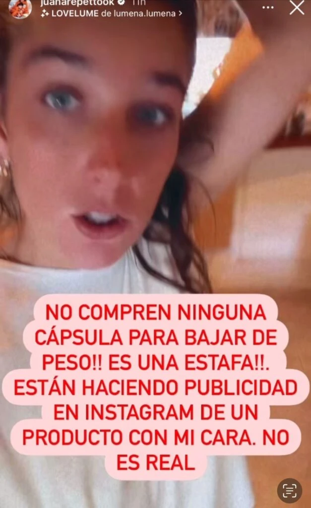 Dirigiéndose a su comunidad, Repetto disparó: “Atención. Parece que hay una estafa donde están vendiendo unas cápsulas para bajar de peso con mi cara. No compren nada. Ni esas ni ninguna. No compren ni tomen nada. Mañana me pondré a investigar. Por dios, no le crean, no compren”.