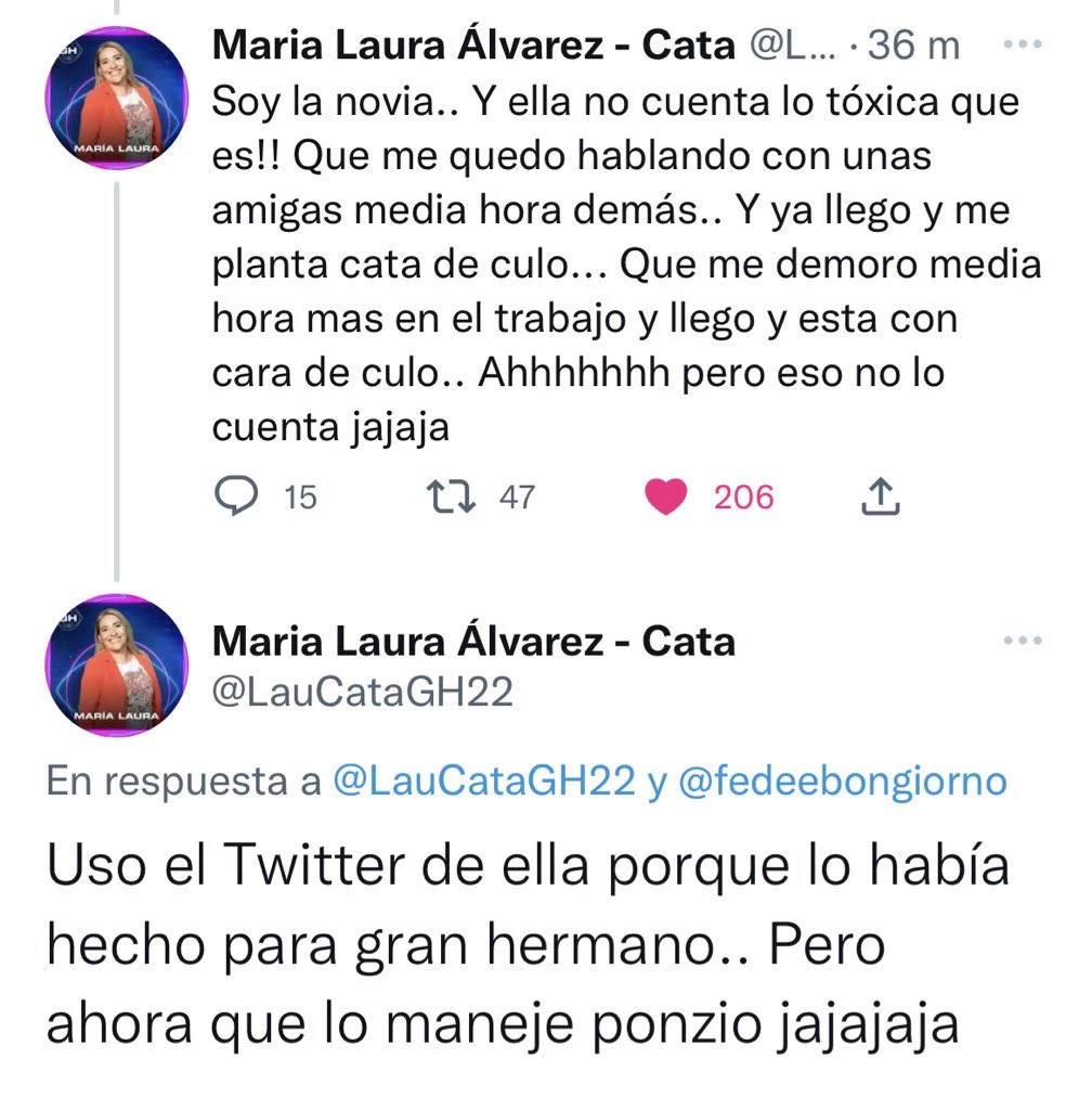 Poco después llegó la respuesta de "La Cata", que lejos de buscar calma trató de tóxica a su chica. "Soy la novia. Y ella no cuenta lo tóxica que es. Que me queda hablando con unas amigas media hora demás, y ya llego y me planta cara de culo... que me demoro media hora más en el trabajo y llego y está con cara de culo. Ahhhhh pero eso no lo cuenta, jajaja. Uso el Twitter de ella porque lo había hecho para Gran Hermano. Pero ahora que lo maneje Ponzio jajaja". Escándalo adentro y afuera.