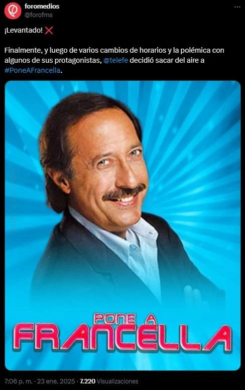 "Levantado. Finalmente, luego de varios cambios de horario y polémica con algunos de sus protagonistas, Telefe decidió sacar del aire a Poné a Francella", anunciaron, a través de una publicación, sobre el programa de Guillermo. Recordemos que, a comienzos de mes, la propia Florencia se manifestó en contra de que la repetición del programa, estuviese al aire.