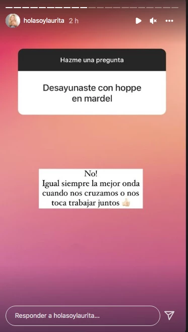 A través de sus stories, el periodista posteó la imagen y agregó como texto: "Desayuno en Mar del Plata". ¿Se hablaron? ¿Cruzaron palabras? ¿Se encontraron en un pasillo? A las horas de todo esto, Laurita se refirió al respecto en su perfil digital y confesó: “No desayuné con él. Igual siempre la mejor onda cuando nos cruzamos o nos toca trabajar juntos”.