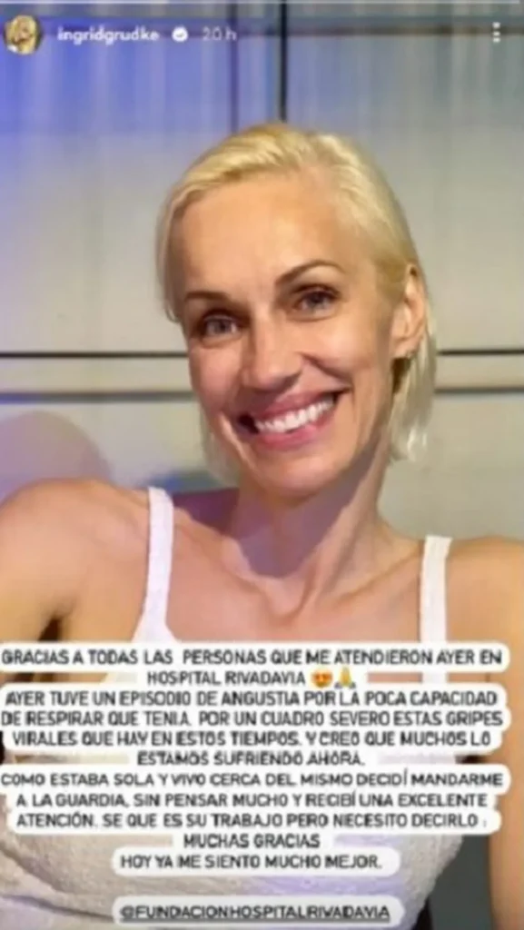 En un mensaje en redes sociales, Grudke agradeció al personal del hospital por la atención recibida: “Gracias a todas las personas que me atendieron ayer en el Hospital Rivadavia. Tuve un episodio de angustia por la dificultad para respirar, a causa de un cuadro severo de gripe viral que está afectando a muchos de nosotros en estos días”.