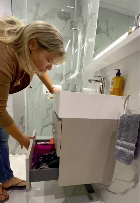 En tonos blancos, grises y negros, al igual que la cocina, Dominique hizo hacer a nuevo los dos baños que tiene la casa con detalles súper luminosos, modernos y prácticos para el uso cotidiano. Espejo con luminaria en led, recinto destacado adentro de la ducha con las mismas características para guardar el shampoo y jabones, entre otros detalles tiene el lugar de higiene personal.