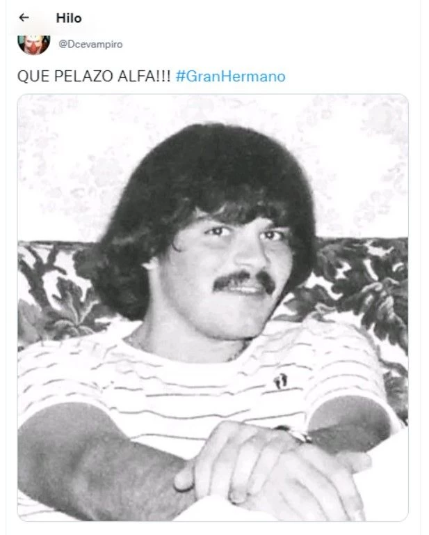 "Qué pelazo", escribió la cuenta @dcevampiro en la red social del pajarito junto a una imagen retro del mayor de los integrantes de la casa de GH luciendo abundante melena y bigotes. Del mismo modo, otro usuario de la misma aplicación subió otra postal del más grande de los hermanitos en sus épocas de juventud y acotó: “El señor Alfa, de 60 años, no me agrada, pero su versión joven no está tan mal".