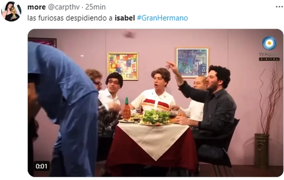 El 7 de enero, Isabel De Negri se despidió de la casa de Gran Hermano tras perder frente a Carla por una buena diferencia de votos: 56,6 por ciento contra los 43,3 para Chula. Por supuesto, la eliminación de la participante no pasó desapercibida para el fandom, que se expresó en las redes con una lluvia de memes.