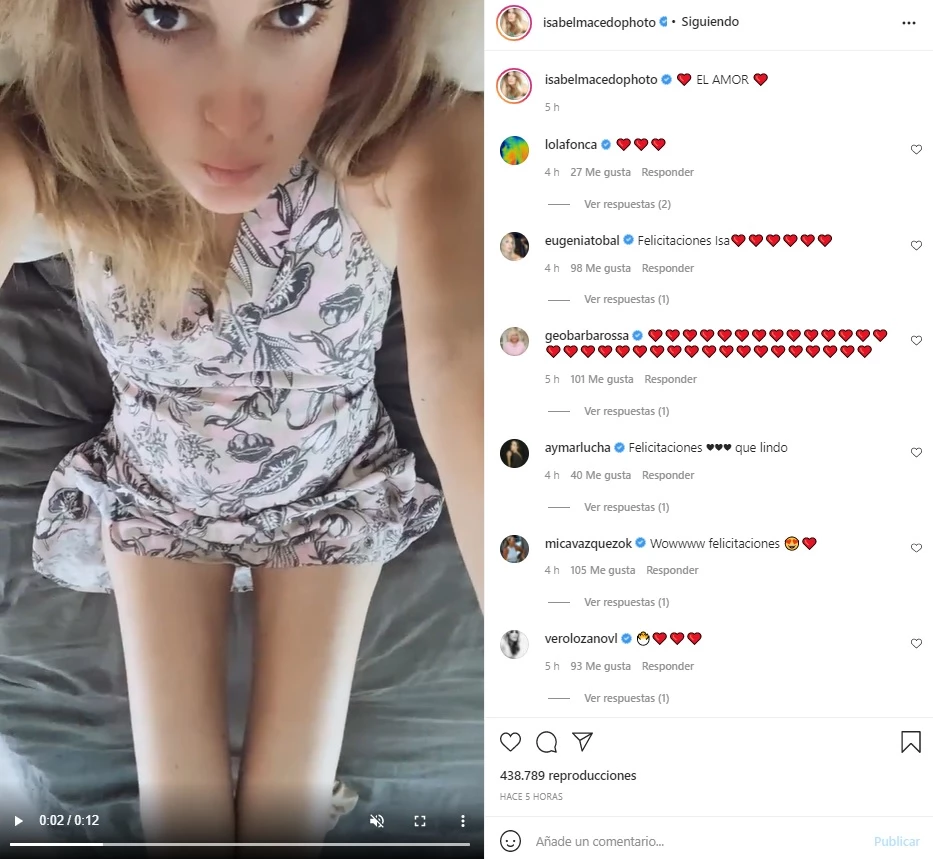 En la descripción de su posteo, escribió: "El amor". A los pocos minutos, la publicación cosechó más de 400 mil reproducciones y se llenó de comentarios de sus seguidores, entre ellos muchas figuras del ambiente como Mica Vázquez, Verónica Lozano, Georgina Barbarossa, Luli Fernández y Dolores Fonzi, entre otros, quienes felicitaron a la pareja por la dulce espera de su segundo hijo.