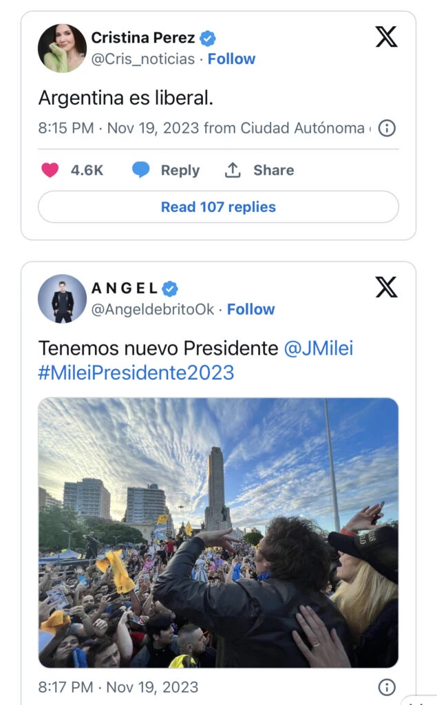Según la información oficial, participó el 76% del padrón electoral. En total, 35.405.013 personas estaban habilitadas para emitir su sufragio.Al conocerse los primeros resultados a las 20 con más del 70% de los votos escrutados, las reacciones no se hicieron esperar. De esta manera, Pamela David, Luli Salazar, Ángel de Brito, Cristina Pérez, Marcos Galperin, Sofía Gonet, Pilar Smith, Lila Limoine, Elon Musk, Alex Caniggia, Connie Ansaldi fueron quienes se manifestaron.
