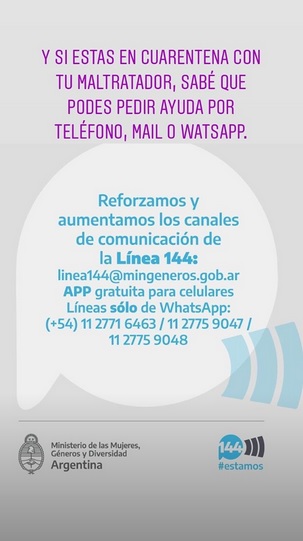 Por último, la directora y guionista compartió las líneas a las que pueden llamar las mujeres que sufren vioencia de género durante la cuarentena.