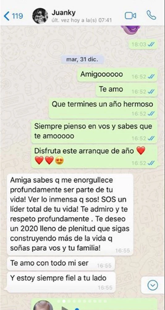 A lo que Juan había respondido con un tierno mensaje. "Amiga, sabés que me enorgullece ser parte de tu vida. Ver lo inmensa que sos. Sos una líder total. Te admiro y respeto profundamente. Te deseo un 2020 lleno de plenitud y que sigas construyendo más de la vida que soñás para vos y tu familia. Te amo con todo mi ser y estoy siempre fiel a tu lado”, decía la respuesta del bailarín.