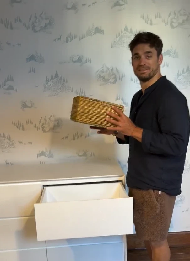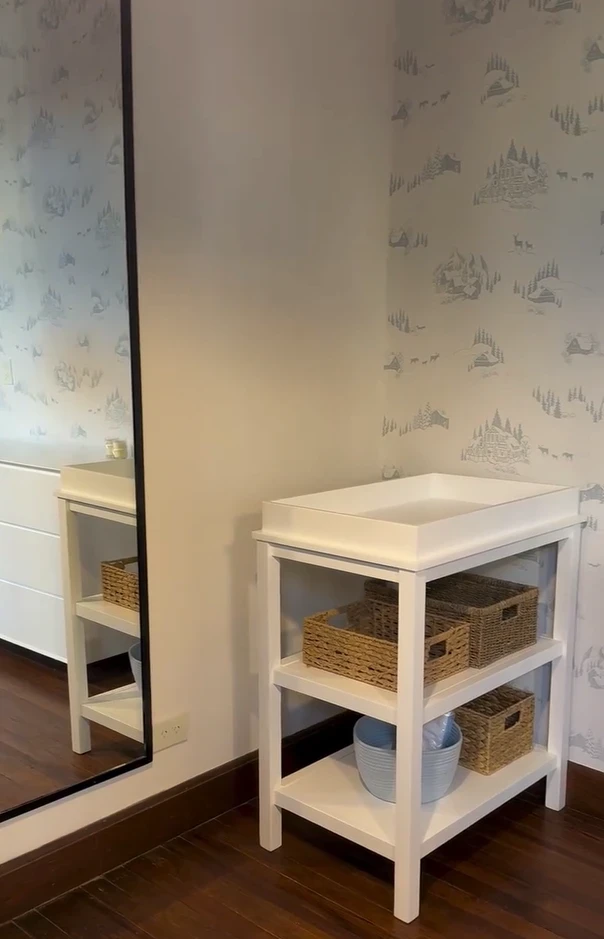 En las fotos que compartió, se puede ver que eligió tonos suaves para las paredes, con un papel decorativo que tiene dibujos de árboles y cabañas en azul profundo. Se sumaron muebles con varios cajones para guardar la ropa del bebé, junto con unos canastos de mimbre rectangulares súper prácticos.