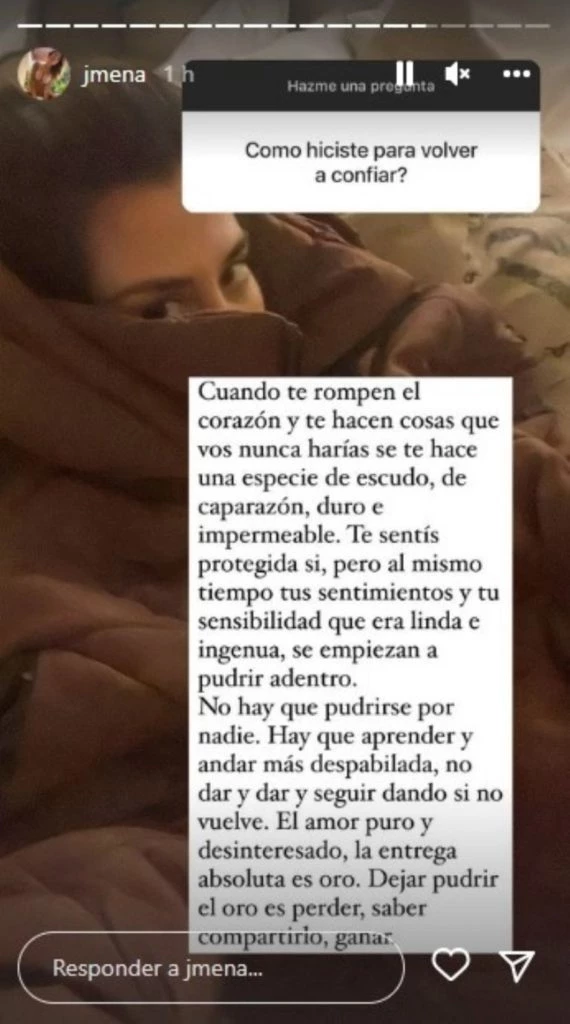 "No hay que pudrirse por nadie. Hay que aprender y andar más despabilada. No dar y dar y seguir dando si no vuelve. El amor puro y desinteresado, la entrega absoluta, todo eso es oro. Dejar pudrir el oro es perder. Saber compartirlo, ganar", agregó Jimena Barón.