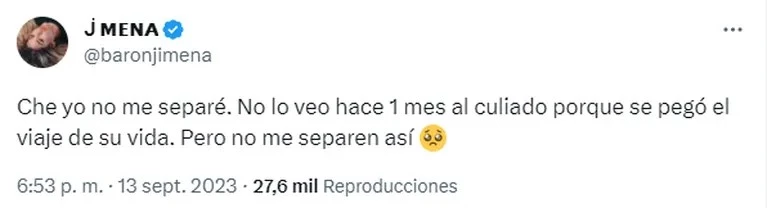 "Che yo no me separe", comenzó su descargo en la red de la X y agrego: "No lo veo hace un mes porque se pegó el viaje de su vida", dejando en claro que la separación es por viajes laborales con mezcla de personales.