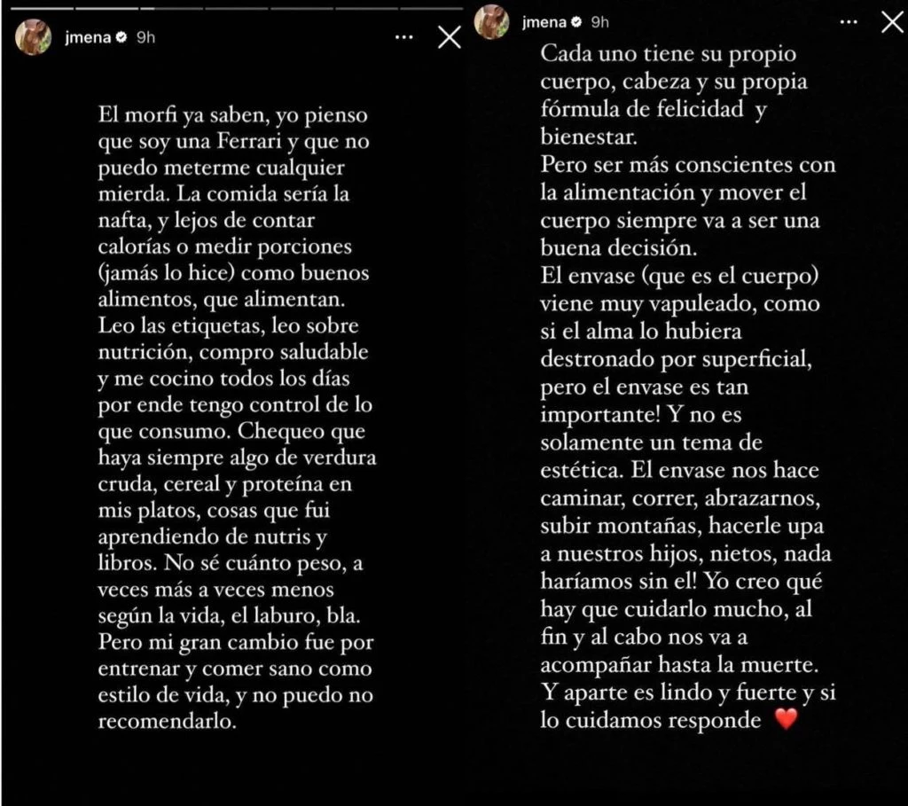 “El morfi, yo pienso que soy una Ferrari y que no puedo meterme cualquier cosa. Sería la nafta y, lejos de contar calorías o medir porciones como buenos alimentos que alimentan. Leo etiquetas, compro saludable y me cocino todos los días . chequeo que haya verdura cruda, cereal y proteínas en los platos. No sé cuanto peso pero mi gran cambio fue por entrenar y comer sano”, amplió Jimena.