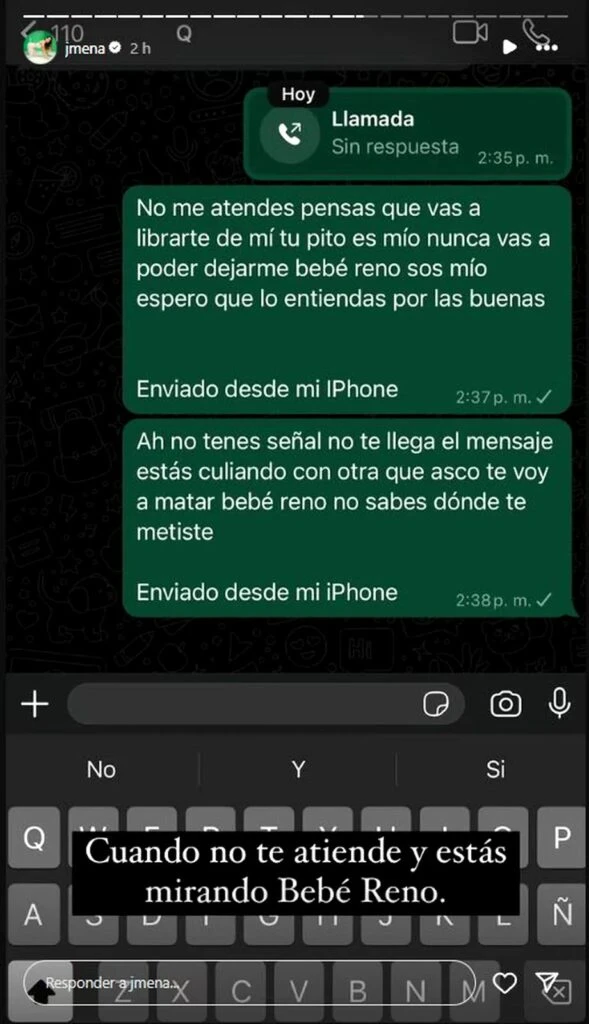 Al mostrar que su pareja no atendía ni respondía, J´mena siguió: “Ah, no tenés señal, no te llega el mensaje. Estás cul... con otra. Qué asco, te voy a matar, bebé reno. No sabés dónde te metiste. Enviado desde mi IPhone”. Al sentirse ignorada, Barón siguió la broma, pero esta vez, a través de un mensaje de voz.