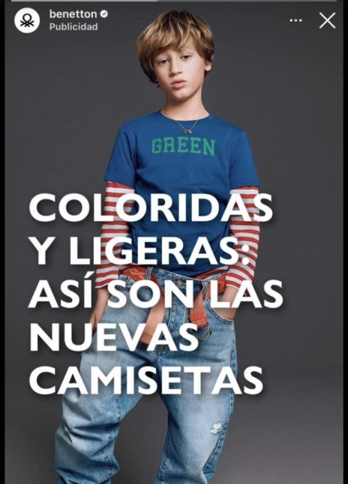 "Coloridas y ligeras, así son las nuevas camisetas de Benetton", comunica la publicidad de la marca que Jimena posteó en su historial de Instagram. Y donde se ve un claro parecido entre el nene que hace la foto con su hijo, fruto de su relación con Daniel Osvaldo.