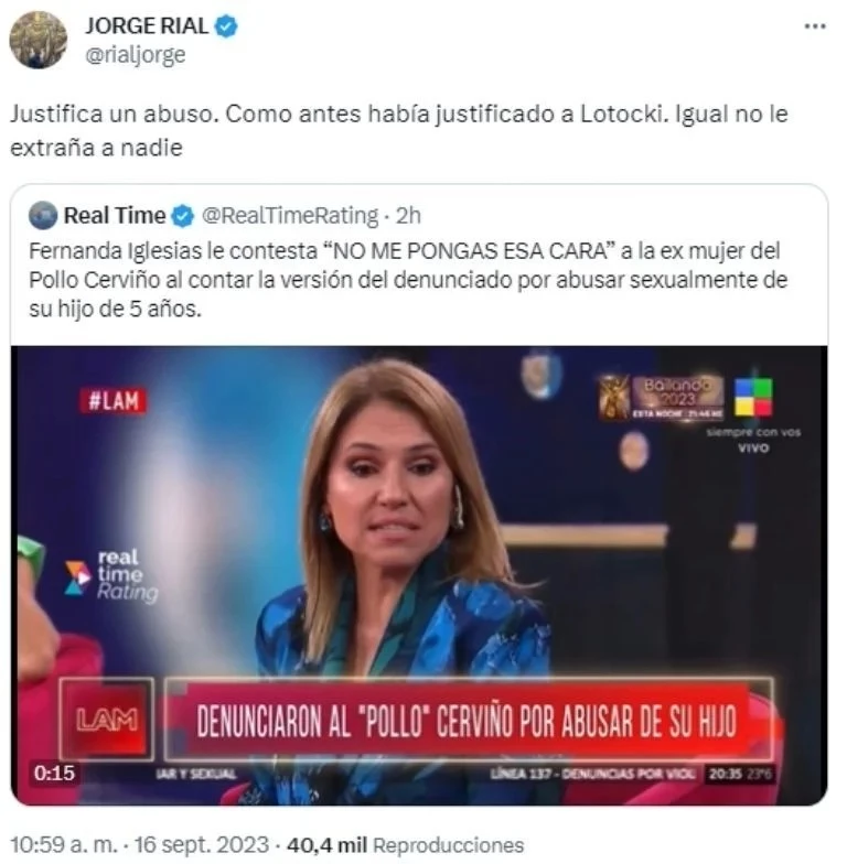 Fue entonces que Jorge Rial decidió utilizar a sus redes sociales para destrozar a la panelista: “Justifica un abuso. Como antes había justificado a Lotocki. Igual no le extraña a nadie”. Sin embargo, Fernando no dijo nada respecto sobre los comentarios del conductor.