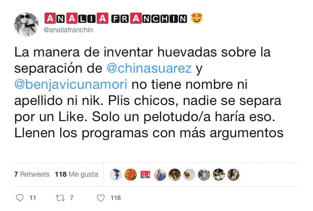 Y luego de ver un tweet de Analía Franchín quien hablaba sobre una de las teorías de la separación que recitaba “La manera de inventar huevadas sobre la separación de la China y Vicuña no tiene nombre ni apellido ni nik. Please chicos, nadie se separa por un like. Solo un pelotudo/a haría eso. Llenen los programas con más argumentos”; Rial disparó: “Salvo que al like lo acompañe algo más. Igual tienen algo de eso”.