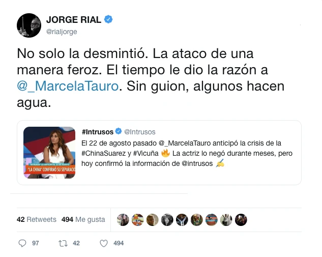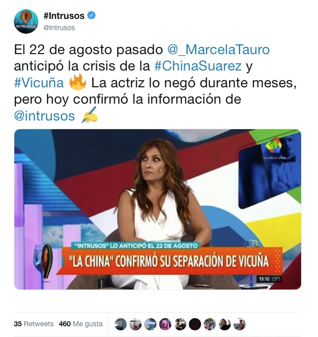 Pero ahora, luego de que la mismísima protagonista confirmara su separación, la cuenta oficial de Intrusos en Twitter remarcó que su periodista ya lo había notificado semanas atrás: “El 22 de agosto pasado Marcela Tauro anticipó la crisis de la ChinaSuarez y Vicuña. La actriz lo negó durante meses, pero hoy confirmó la información de Intrusos”.