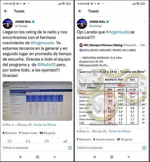 "Llegaron los rating de la radio y nos encontramos con el hermoso crecimiento de Argenzuela. Ya estamos terceros en la general y en segundo lugar en promedio de tiempo de escucha. Gracias a todo el equipo del programa y de Radio 10 pero, por sobre todo, a los oyentes!!! Gracias", remarcó Rial, que después de mucho tiempo volvió a sentir una caricia de las planillas del rating.