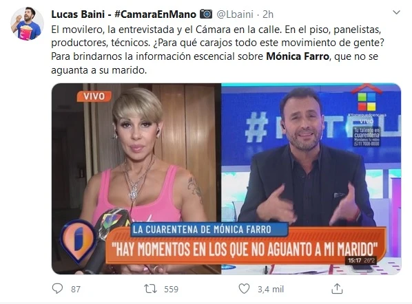 “El movilero, la entrevistada y el Cámara en la calle. En el piso, panelistas, productores, técnicos. ¿Para qué carajos todo este movimiento de gente? Para brindarnos la información escencial sobre Mónica Farro, que no se aguanta a su marido”, escribió un usuario a modo de denuncia.