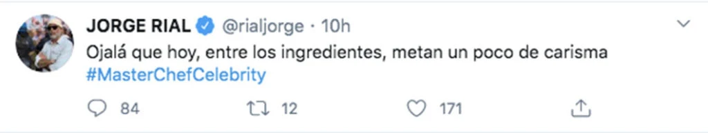 “Ojalá que hoy, entre los ingredientes, metan un poco de carisma”, escribió Jorge Rial con ironía en su cuenta de Twitter junto al Hashtag de MasterChef Celebrity. Aquellas palabras generaron una gran reacción por parte del público, que le respondió duramente al intruso.