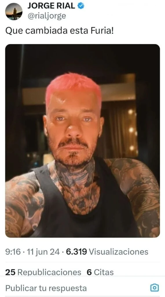 Fiel a su estilo picante, irónico y filoso, Jorge Rial capturó la publicación de Tinelli luciendo su nueva cabellera fucsia, la replicó en su cuenta de twitter y debajo comentó:”¡Qué cambiada está Furia!". Por su puesto, la comparación con la participante de gran Hermano abrió al debate virtual.