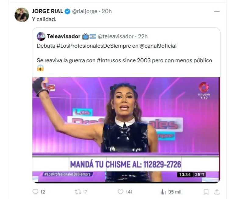 Todo comenzó cuando la cuenta una cuenta comentó en X sobre el debut de Los Profesionales de Siempre y el enfrentamiento con Intrusos: "Se reavivó la guerra con menos público". Sin dudarlo, Rial intervino y lanzó: "Y con menos calidad".